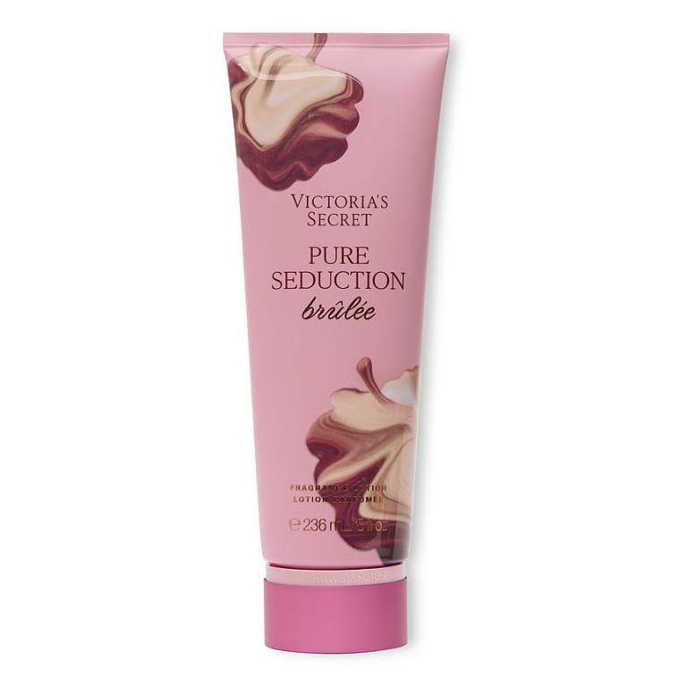 Crema Victoria’s Secret Pure Seduction Brûlée 236 ml, loción hidratante con aroma de fresa confitada y vainilla dulce. Suaviza e hidrata con fragancia gourmand.